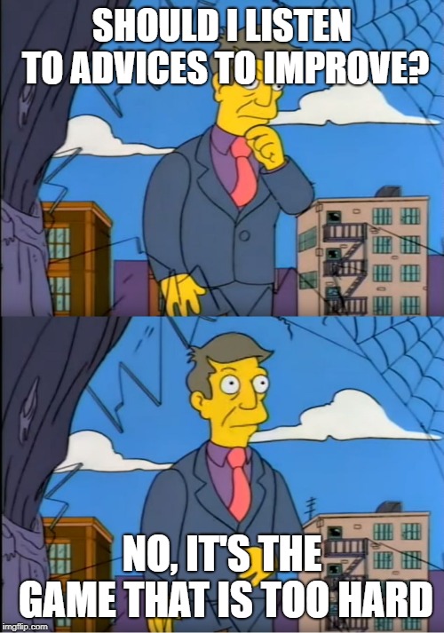 • @zormis I also notice an influx of newish players coming on the forums to whine and complain give feedback, then lash out when given advice on how to deal with their issues. Don't you dare try help them get better at the game!! They see it as being condescending and being told to gasp "git gud".